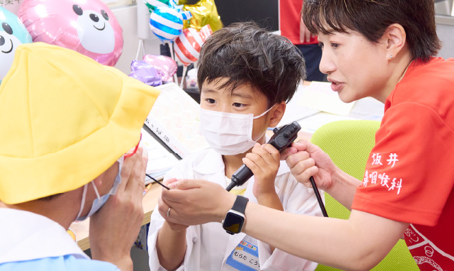 のどをアーンして診察中。未来のドクター診察体験!